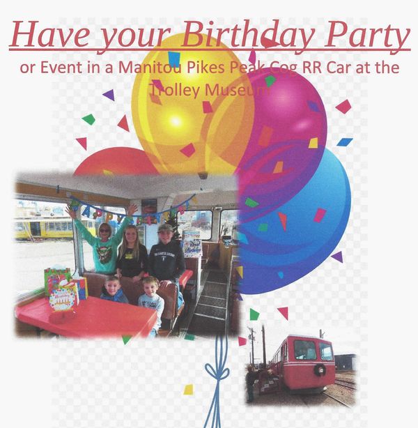 With tables set up between the booth seats, the Cog car is a great place to hold birthday parties, meetings or other events. Call the Museum to reserve a time, 719-475-9508.Birthday "person" and two parents are free. Admission required by all attendees. Adult/Senior/Military get $2 off regular admission. Attendees get a tour of the museum and trolley ride. There is a $40 fee for use of the Cog car (2 hours) during normal business hours. (Will consider off hours at an additional charge.) Please contact museum to reserve car, 719.475.9508.